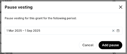 7. Add the time period you wish to pause the vesting schedule of the grant - then click the black button Add pause.