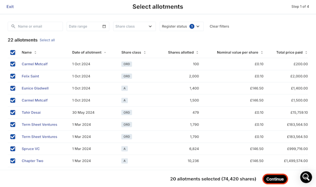 A register of allotments is a record that keeps track of the applications received and shares allotted by a company. It serves as a comprehensive register for the company's shares and provides important information about the shareholders. The company might need to file the register of allotments within Companies House. If this the first time using the register, please ensure you have completed the Company Registers Set-up On Carta to successfully use the Register of Allotments.