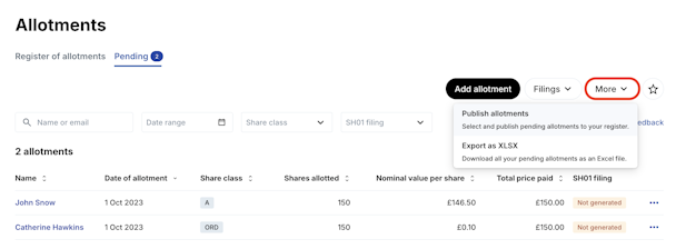 1. Navigate to Company registers > Allotments > Pending.
