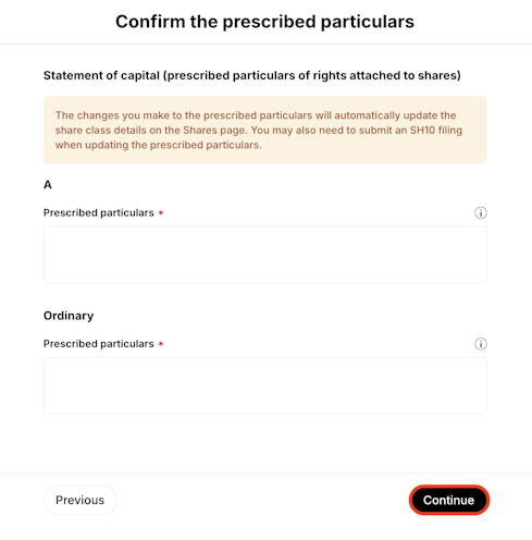 4. Confirm or add the prescribed particulars for each share class included in the SH01 > click Continue.