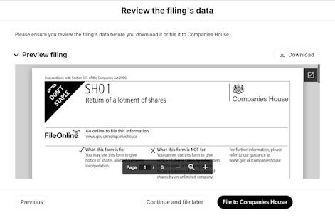 5. Review the filings data by clicking Continue and file later or click File to Companies House in order to file your SH01 directly to Companies House through Carta.