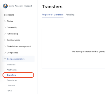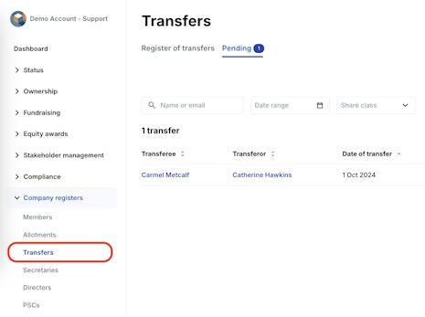 1. Navigate to Company registers > Transfers > Register of transfers.