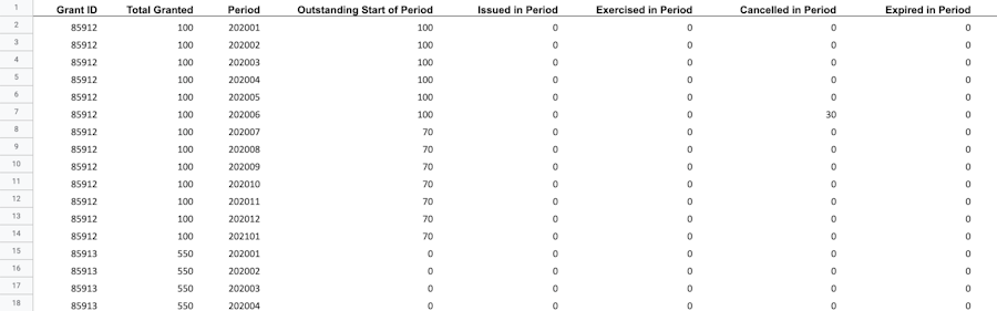 This worksheet shows each vesting tranche represented by period and grant ID.