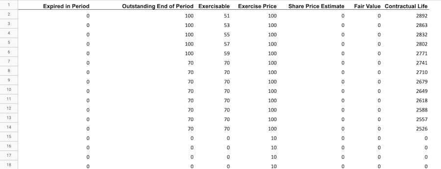 This worksheet details the expected future value of each grant specific to each tranche. To calculate this, we calculate the expense per award based on the number of days in the period and match the vesting schedule of the award.