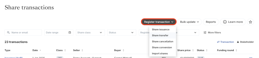 2. Click Register transaction > Share transfer.