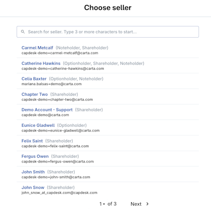 3. Click on the name of an individual to select the seller (transferor) from the list of shareholders you currently have in your cap table.