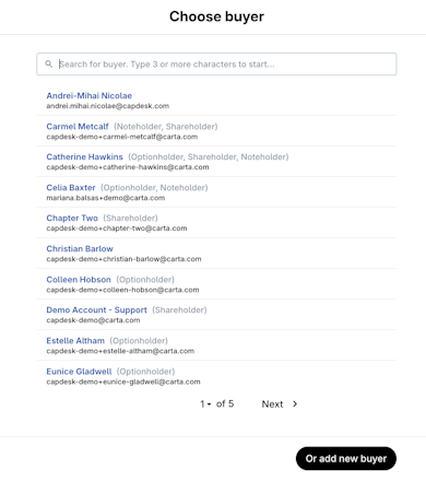 4. Click on the name of an stakeholder to select the buyer (transferee) from a list of stakeholders of your company or click Add new buyer in case the transferee is not yet in your cap table.