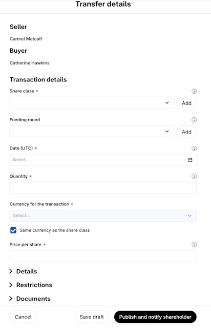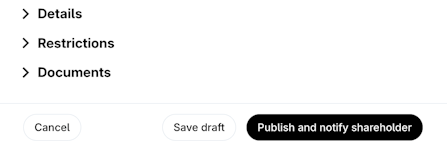 6. Click Publish and notify shareholder if you would like to publish the transaction on your cap table or Save draft if you want to save the information and review it later.