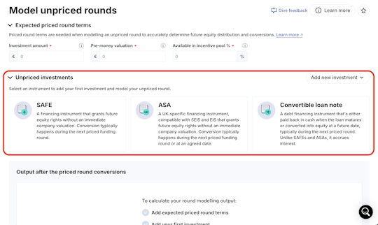 1. Navigate to Fundraising > Unpriced round modelling.