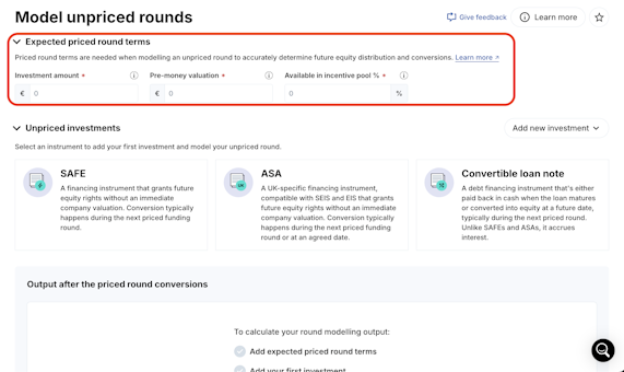 2. Fill out the expected priced round terms needed to calculate the conversions of the unpriced investments (SAFEs, ASAs and Convertible notes). Click the information icon (i) next to each instrument for a detailed explanation.