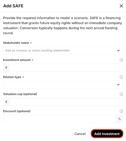 When adding the investment, you can either create a new, temporary stakeholder (not added to the actual cap table), or select an existing stakeholder from the cap table. Once all the required information has been added click Add investment.