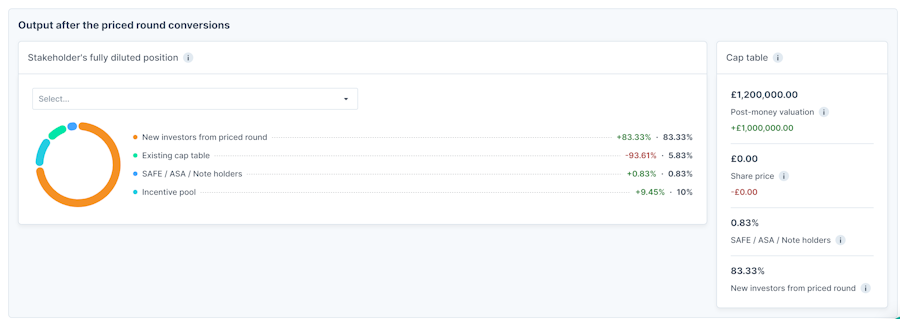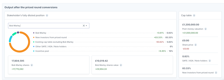 You can select one of the stakeholders (either new investors from the convertibles or existing stakeholders) to see how the conversions and new priced round terms are affecting their ownership.