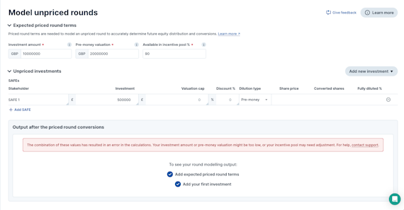5. Not all values input can result in valid calculations. For example, using a target available pool too high may not leave enough remaining equity for the priced investors and convertible loan notes ownership, in which case we display an error message prompting you to revisit the inputs.
