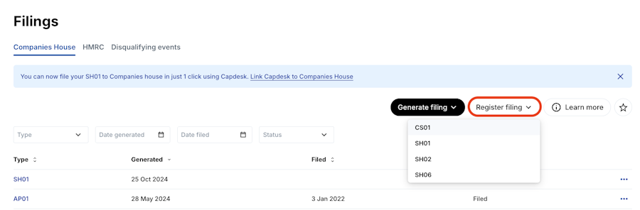 2. Click Register filing > Select the type of filing you wish to upload. In this article we will use CS01 as an example, but the workflow is applicable to SH01, SH02 and SH06 as well.